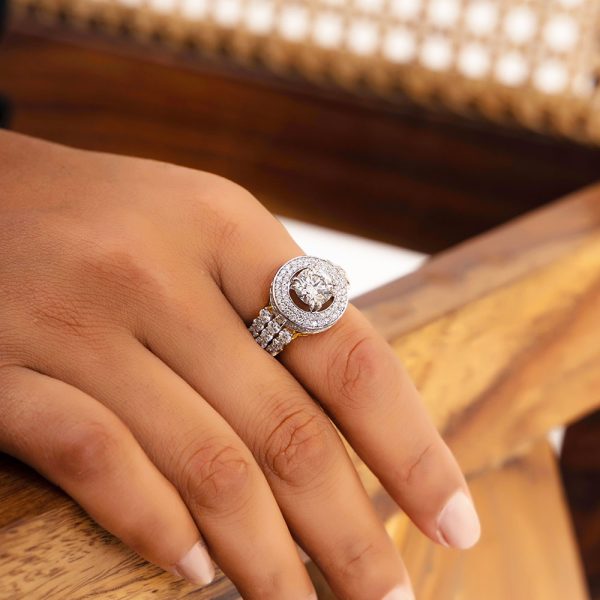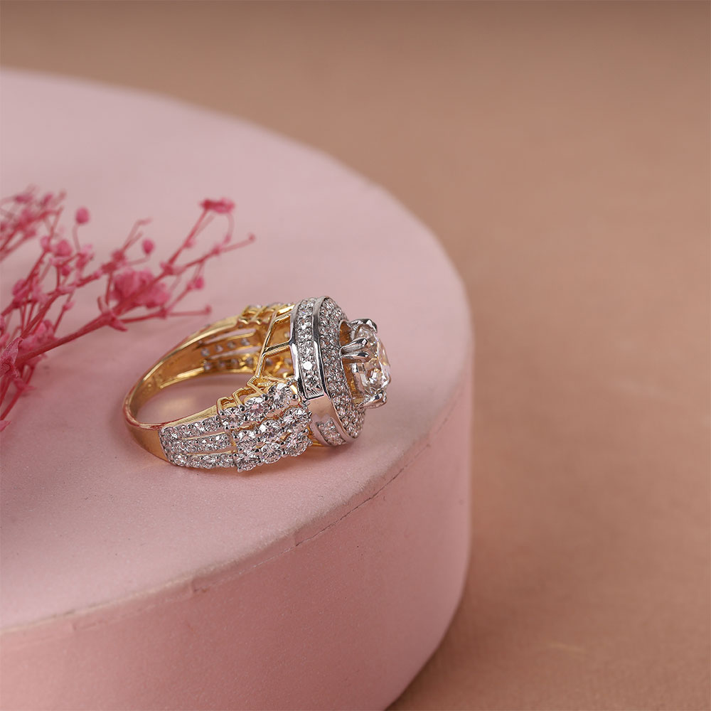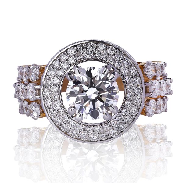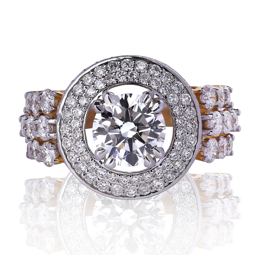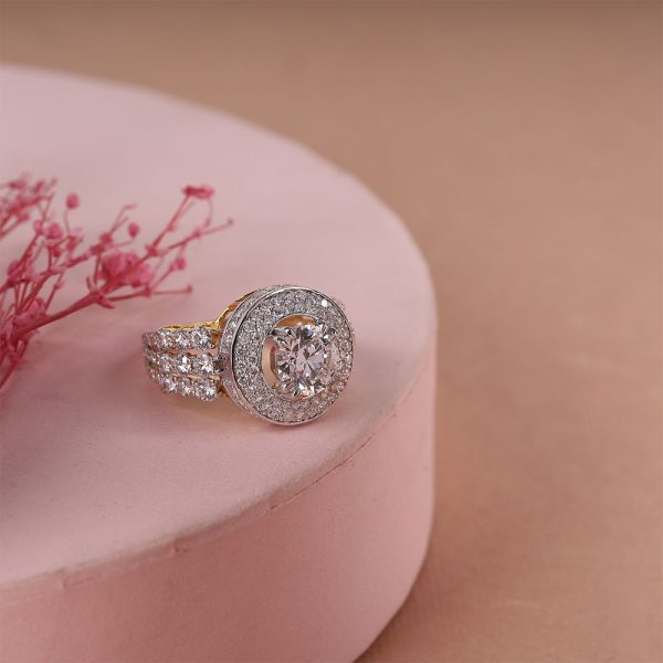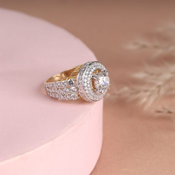 The Big Round Diamond Ring in gold radiates brilliance with its sizable, round diamond that captures and reflects light in an unmatched fashion. This exquisite piece, set in a luxurious band of gold, serves as a bold testament to sophistication and glamour, making it a truly stunning statement.