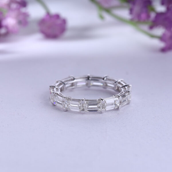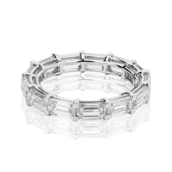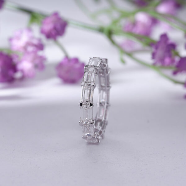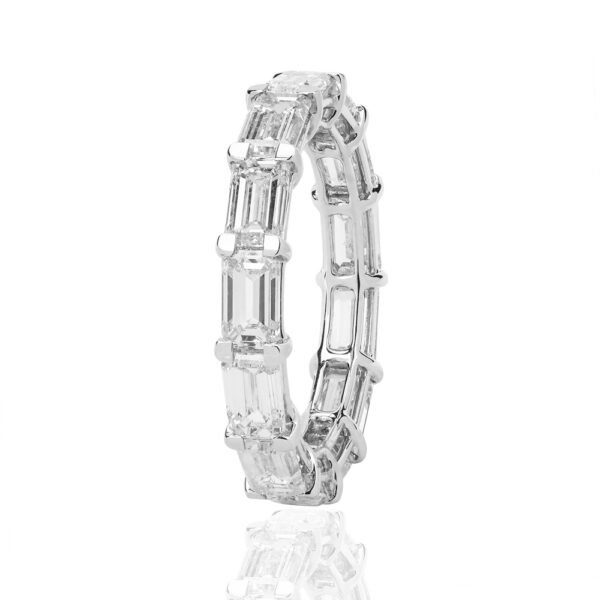 This sleek band ring features a row of baguette-shaped diamonds, set in lustrous white gold, offering a contemporary twist on a classic design with its clean lines and elegant simplicity.