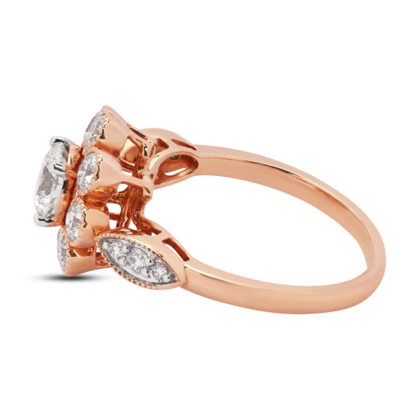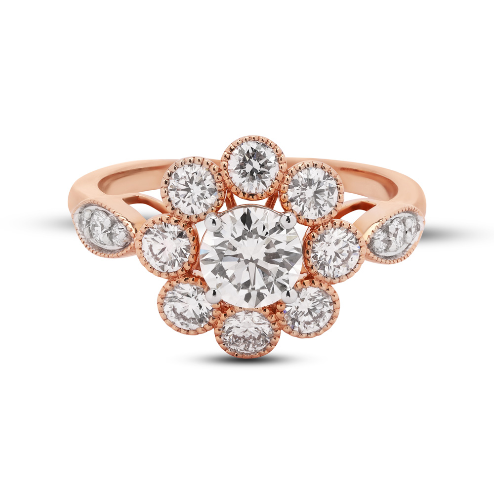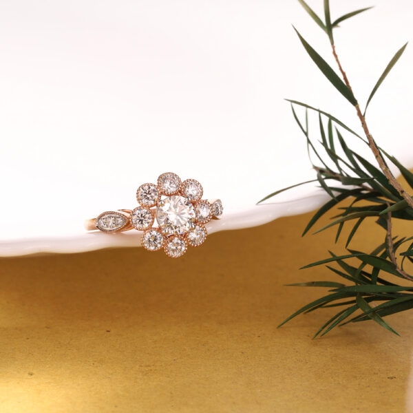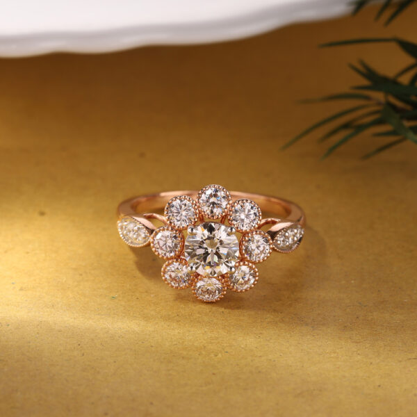 This unique engagement ring features a captivating round diamond at its center, set in a delicate rose gold band, which enhances the stone’s brilliance and adds a modern twist to a classic design.