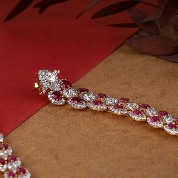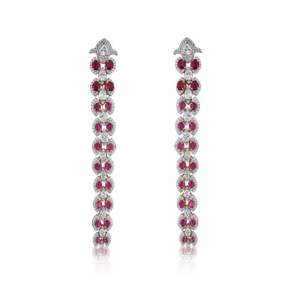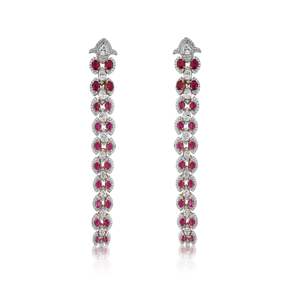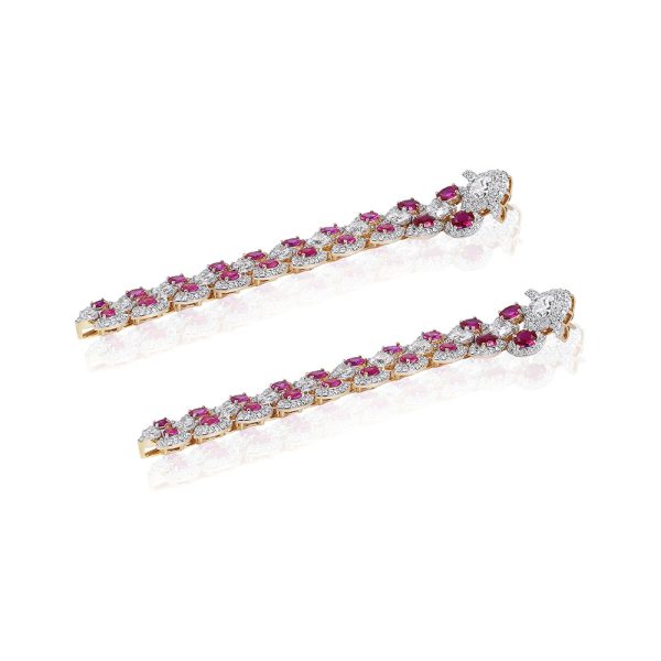 Diamond & Ruby Danglers in Gold – stunning earrings that elegantly combine the allure of diamonds and rubies dangling from radiant gold settings. This exquisite pairing creates a mesmerizing display of color and sparkle, making a striking accessory that perfectly complements any attire with effortless charm.