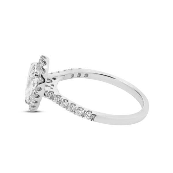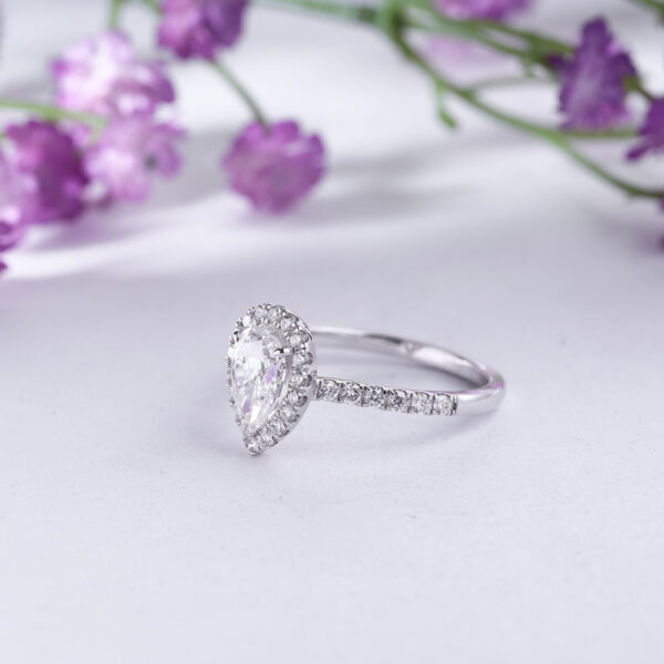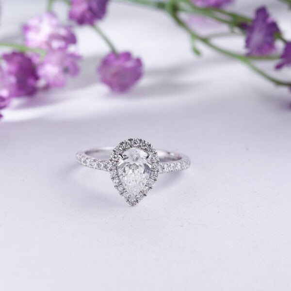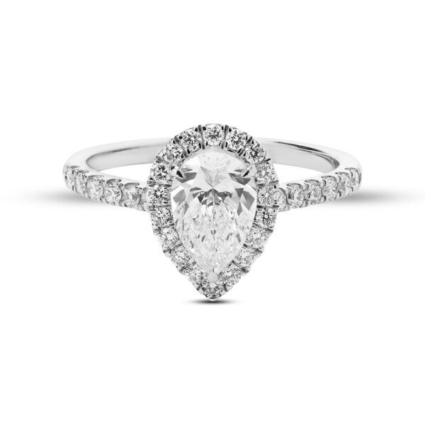 A stunning pear-shaped diamond ring, set in sleek white gold, which accentuates the diamond’s teardrop silhouette and provides a modern yet timeless look with its lustrous finish.