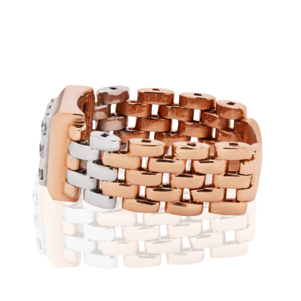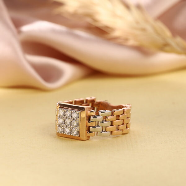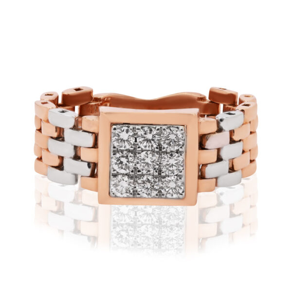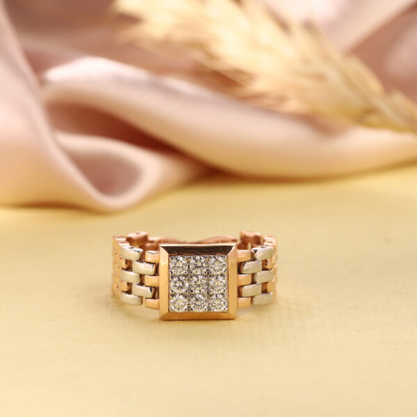 An elegant ring with a square-shaped design, featuring small round cut diamonds set meticulously within the square, all crafted in a fine band that enhances the geometric beauty and sparkle.