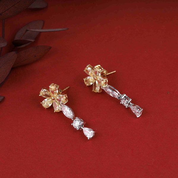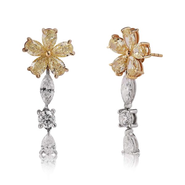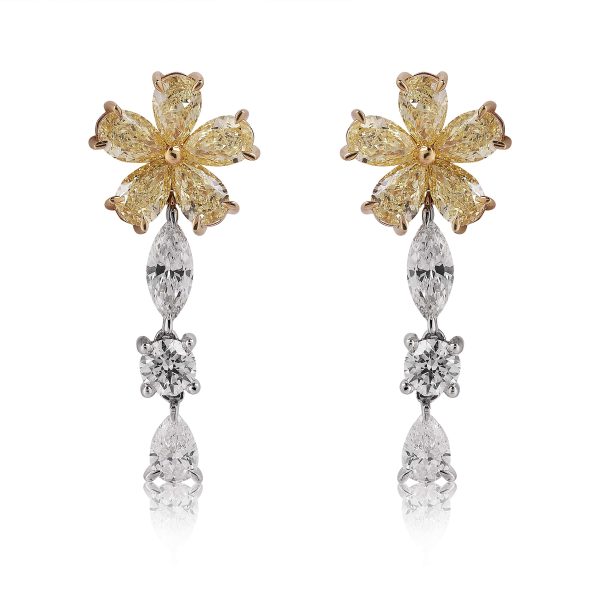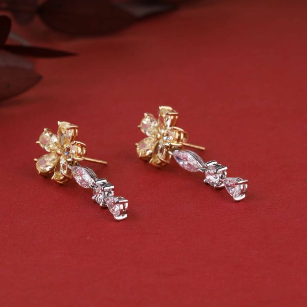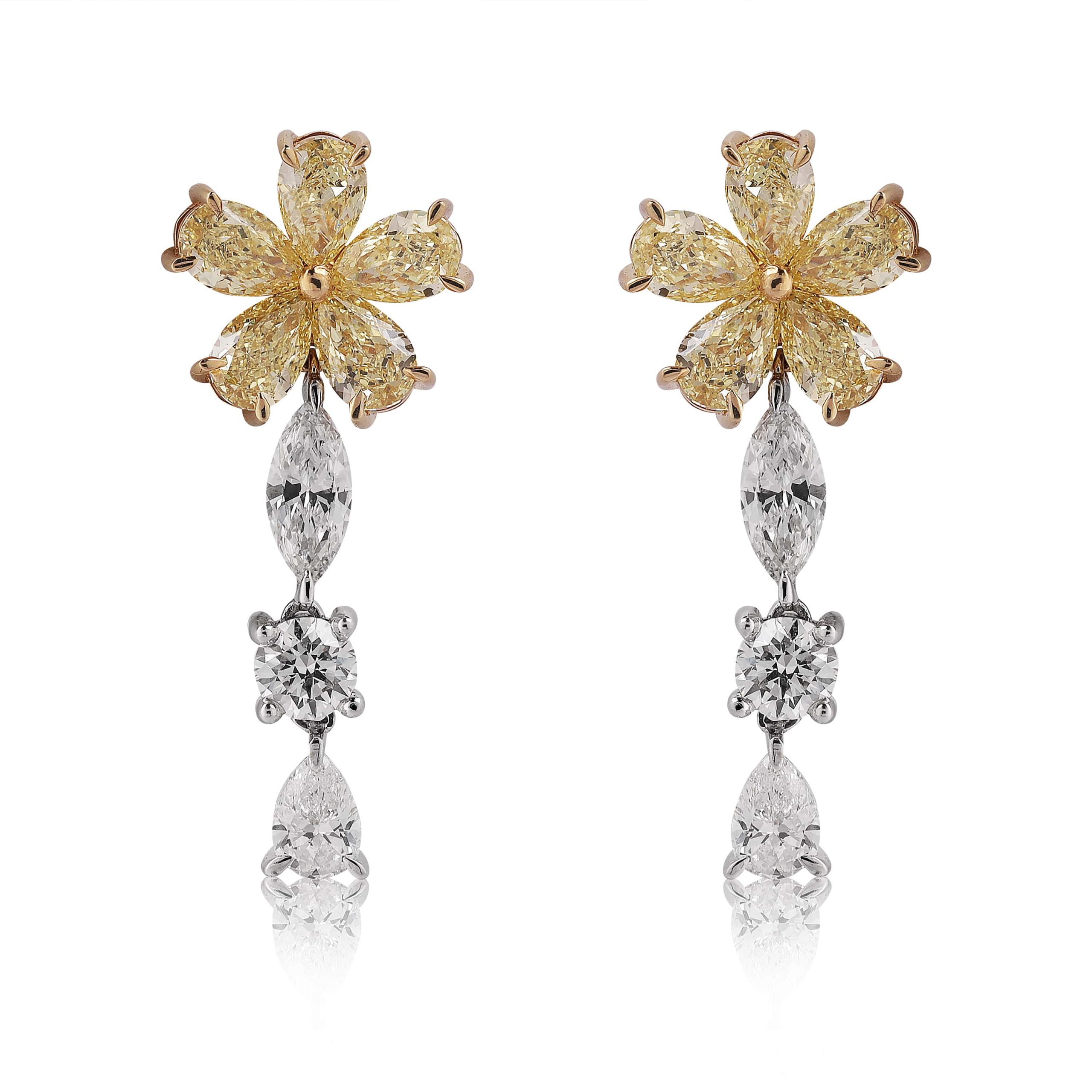 Evergreen Diva Petals Drop Earrings, where yellow and white diamonds intertwine in a harmonious dance, gracefully suspended to enhance your allure. With a timeless appeal, these earrings are a symbol of eternal sophistication and refined elegance.